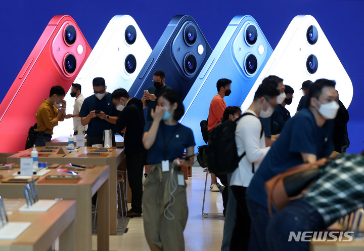 [서울=뉴시스] 백동현 기자 = 애플의 신형 스마트폰 아이폰13 시리즈 판매가 시작된 8일 오전 서울 강남구 Apple 가로수길에서 고객들이 제품을 살펴보고 있다. 2021.10.08. [email protected]