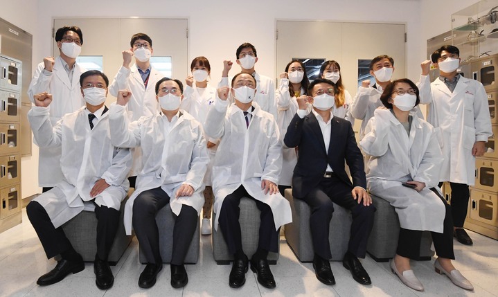 [서울=뉴시스] 홍남기 부총리 겸 기획재정부 장관이 8일 경기도 성남시 분당구 판교 SK바이오사이언스를 방문해 코로나19 백신개발 진행상황을 점검한 뒤 관계자들과 기념촬영을 하고 있다. (사진=기획재정부 제공) 2021.10.08. [email protected] *재판매 및 DB 금지