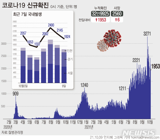 [서울=뉴시스]9일 0시 기준 코로나19 일일 신규 확진자가 1953명으로 집계됐다. 국내 발생 확진자는 1924명, 해외 유입 29명이다.  (그래픽=안지혜 기자)