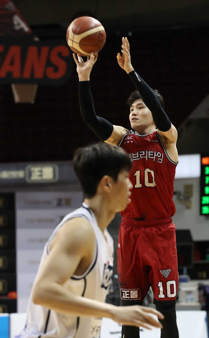 [안양=뉴시스] 박미소 기자 = 9일 오후 경기 안양실내체육관에서 열린 2021-2022 프로농구 안양 KGC 인삼공사와 전주 KCC의 경기, 안양 문성곤이 슛을 시도하고 있다. 2021.10.09. [email protected]
