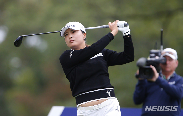 [웨스트콜드웰=AP/뉴시스] 고진영이 9일(현지시간) 미 뉴저지주 웨스트 콜드웰의 마운틴 리지 컨트리클럽에서 열린 미국여자프로골프(LPGA) 투어 코그니전트 파운더스컵 3라운드 6번 홀에서 티샷하고 있다. 고진영은 중간합계 13언더파 200타로 사흘째 단독 선두를 유지하고 있다. 2021.10.10.