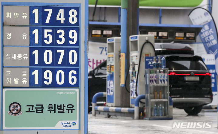 [서울=뉴시스] 정병혁 기자 = 전국 주유소 휘발유 가격이 3주 연속 상승하고 있는 가운데 10일 오후 서울시내 한 주유소에 유가 정보가 표시돼 있다. 한국석유공사 유가정보서비스 오피넷에 따르면 10월 첫째 주 전국 주유소의 휘발유 판매 가격은 지난주 보다 8.7원 오른 리터 당 1654.4원을 기록했다. 2021.10.10. [email protected]