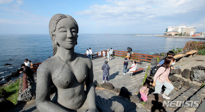 [제주=뉴시스] 우장호 기자 = 한글날 연휴 이틀째인 10일 오후 제주 시내권 대표적인 관광지인 용두암이 여행객으로 붐비고 있다. 제주관광협회는 연휴 기간 15만8000여명의 관광객이 제주를 찾아 지난해 같은 기간 보다 방문객이 10.2% 늘어날 것으로 전망했다. 2021.10.10. [email protected]