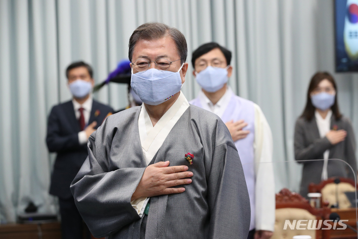 [서울=뉴시스] 김진아 기자 = 문재인 대통령이 12일 오전 청와대 여민관 영상회의실에서 열린 국무회의에 가을 한복문화주간을 맞아 한복을 입고 참석, 국민의례를 하고 있다. 2021.10.12. [email protected]
