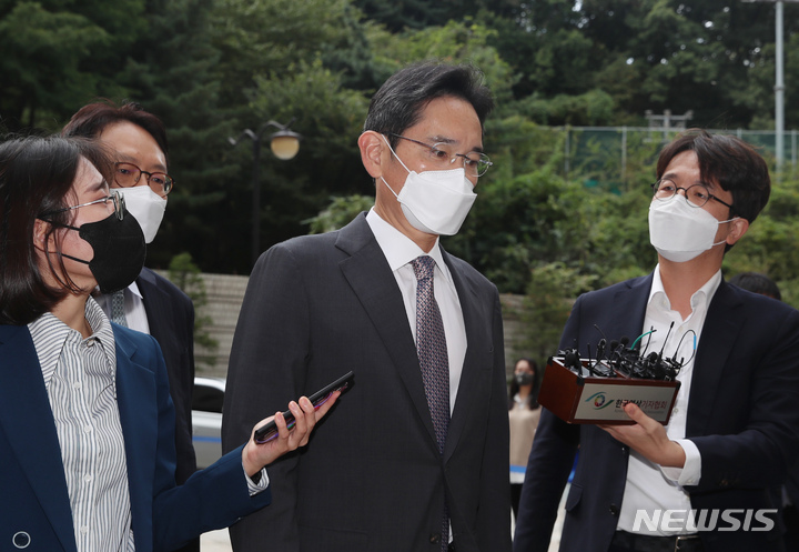 [서울=뉴시스] 고승민 기자 = 프로포폴을 불법 투약한 혐의로 기소된 이재용 삼성전자 부회장이 12일 서울중앙지방법원에서 열린 첫 공판에 출석하며 취재진 질문을 받고 있다. 2021.10.12. [email protected]