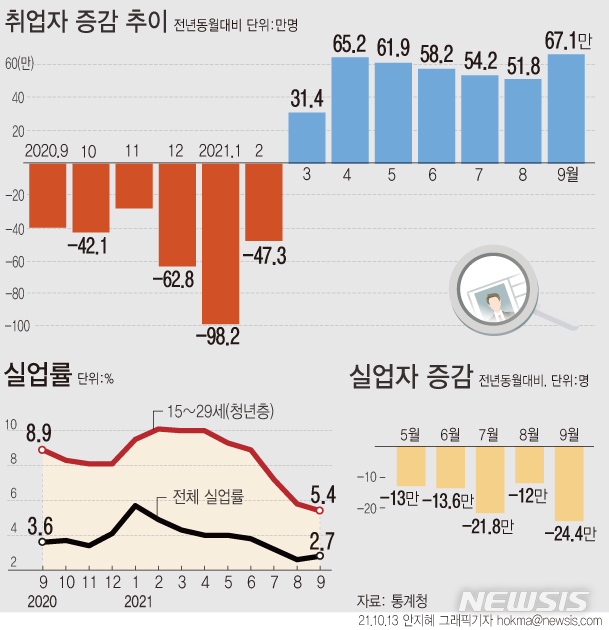 [서울=뉴시스] 13일 통계청에 따르면 지난달 취업자 수는 2768만3000명으로 1년 전보다 67만1000명(2.5%) 늘며 7개월 연속 오름세를 보였다. 7년 6개월 만에 가장 많이 증가한 것으로 증가 폭도 4월 이후 5개월 만에 확대됐다. (그래픽=안지혜 기자)
