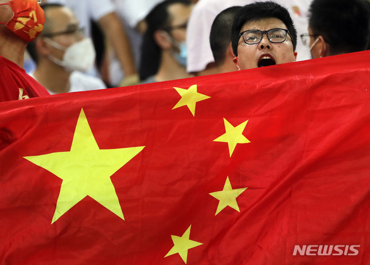 [지다=AP/뉴시스] 한 중국 축구팬이 12일(현지시간) 사우디아라비아 지다의 킹 압둘라 스포츠 시티 스타디움에서 열린 2022 카타르 월드컵 아시아 최종예선 B조 4차전 사우디와의 경기 중 중국 국기를 들고 응원하고 있다. 중국은 사우디에 2-3으로 패하며 1승3패(승점3)로 조 5위에 머물렀다. 2021.10.13.
