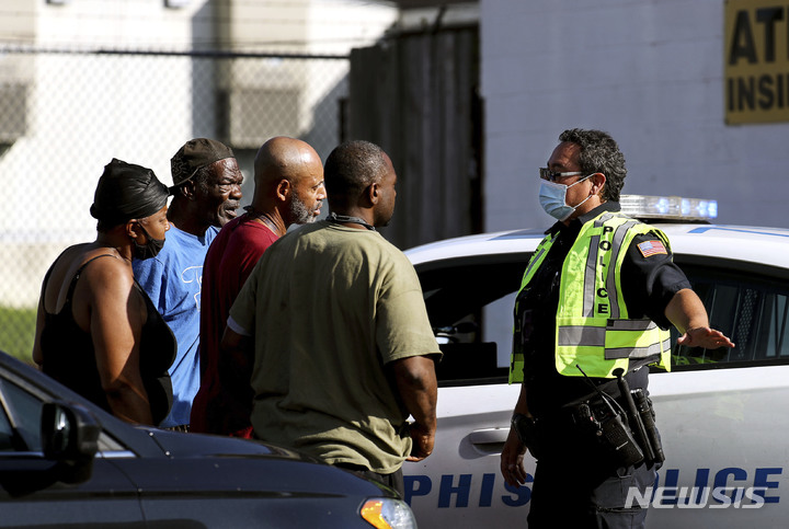 [오렌지마운드=AP/뉴시스] 12일(현지시간) 미 테네시주 멤피스의 오렌지 마운드에 있는 우체국에서 총격이 발생한 후 한 경찰관이 현장 부근에서 주민들과 얘기를 나누고 있다. 경찰은 이 총격으로 우체국 직원 3명이 숨졌으며 이중엔 스스로 목숨을 끊은 것으로 보이는 총격범도 포함돼 있다고 밝혔다. 2021.10.13.