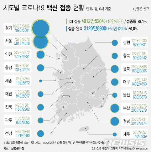 [서울=뉴시스] 12일 코로나19 예방접종 대응 추진단에 따르면 시도별 누적 1차 접종자 수는 경기도가 1046만5436명으로 가장 많고, 이어 서울 751만6070명, 부산 258만2076명, 경남 255만6731명 등이다. 지역별로 1차 접종률이 높은 곳은 전남 80.8%로 가장 높다. (그래픽=전진우 기자)