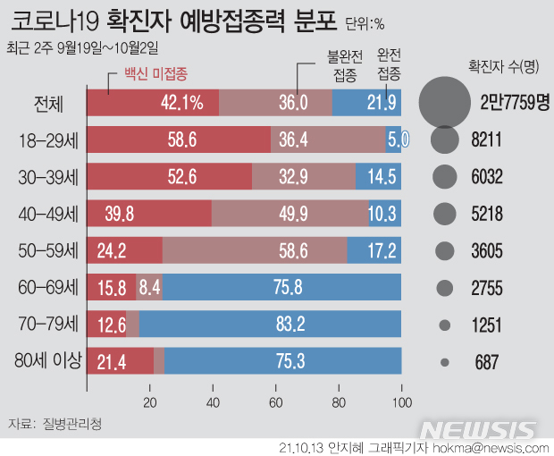 [서울=뉴시스] 13일 질병관리청에 따르면 9월19일부터 10월2일까지 만 18세 이상 확진자는 2만7759명이다. 이 가운데 백신 미접종자나 불완전 접종군이 57.9%(1만6086명)를 차지했다. (그래픽=안지혜 기자)