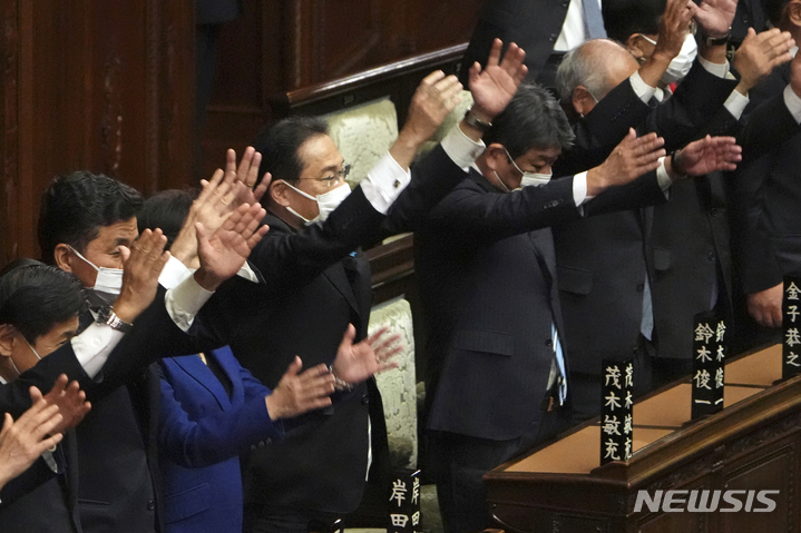 [도쿄=AP/뉴시스] 기시다 후미오 일본 총리(왼쪽 네 번째)와 의원들이 14일 도쿄 임시 각의에서 중의원을 해산한 후 만세삼창을 하고 있다. 일본은 기시다 총리 내각 출범 4주 만에 중의원이 해산되면서 오는 31일 총선을 치른다. 2021.10.14.