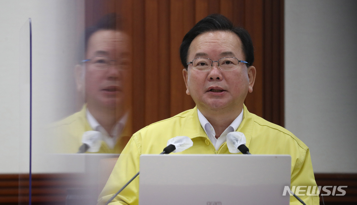[서울=뉴시스] 김명원 기자 = 김부겸 국무총리가 15일 오전 서울 종로구 정부서울청사에서 열린 코로나19 중앙재난안전대책본부(중대본) 회의에 참석해 발언하고 있다. 이날 김부겸 총리는 사회적 거리두기 조정방안에 대해 4단계 지역인 수도권은 미접종자 최대 4명 포함 8명까지, 3단계지역 접종완료자 6명 등 최대 10명까지 모임이 가능하다고 밝혔다. (공동취재사진) 2021.10.15. [email protected]