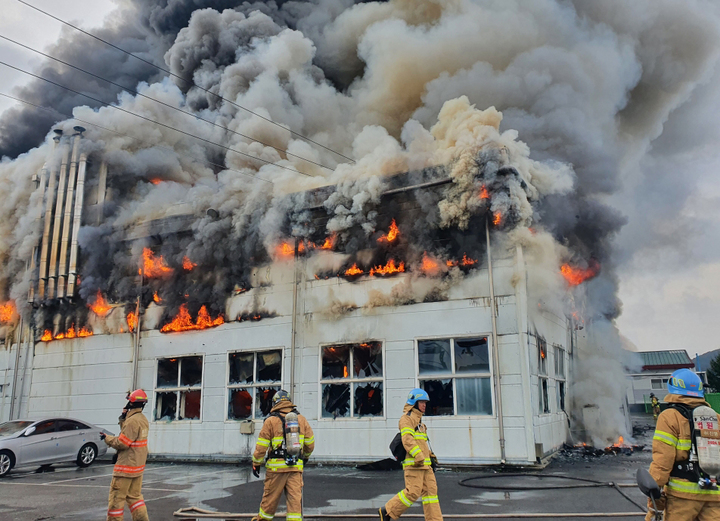 [서울=뉴시스] 15일 오전 8시 40분께 경기도 파주시 파평면 금파리에 위치한 한 식품공장에서 화재가 발생해 소방대원들이 화재진압을 하고 있다. (사진=파주소방서 제공) 2021.10.15. [email protected] *재판매 및 DB 금지