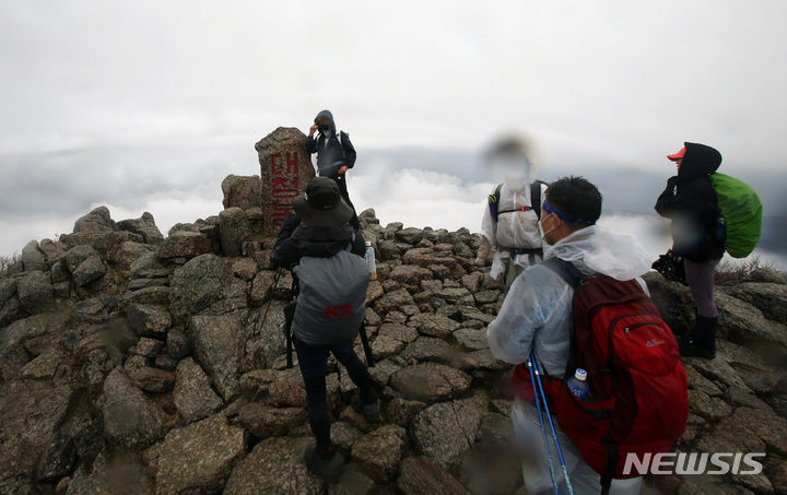 [양양=뉴시스] 김경목 기자 = 가을비가 내린 15일 등산객들이 강원도 양양군 설악산 국립공원 남설악 코스를 타고 오른 해발 1708m 대청봉에서 기념사진을 촬영하며 등반의 고통을 씻어내고 있다. 하절기(4~10월) 입산 시간은 오전 3시부터 낮 12시까지, 동절기(11~3월)는 오전 4시부터 오전 11시까지다. 위반 시 자연공원법에 의거 과태료 처분을 받는다. 2021.10.16. [email protected]