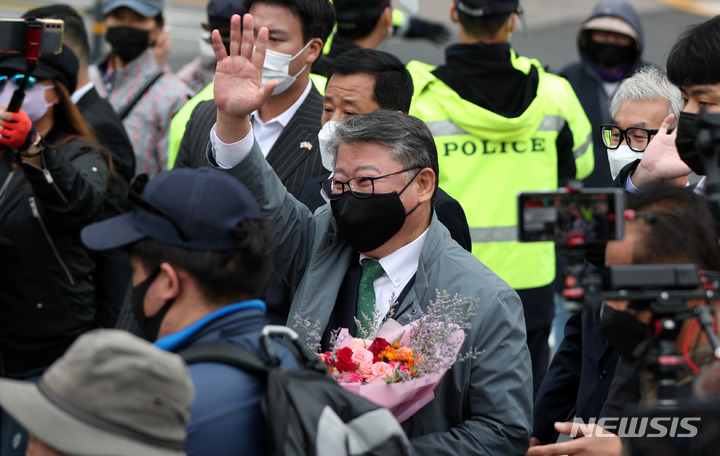 [서울=뉴시스] 추상철 기자 = 당 대통령후보로 선출된 조원진 우리공화당 대표가 16일 오후 서울 중구 서울광장에서 열린 기자회견에 참석하며 지지자를 향해 손을 흔들고 있다. 2021.10.16. [email protected]