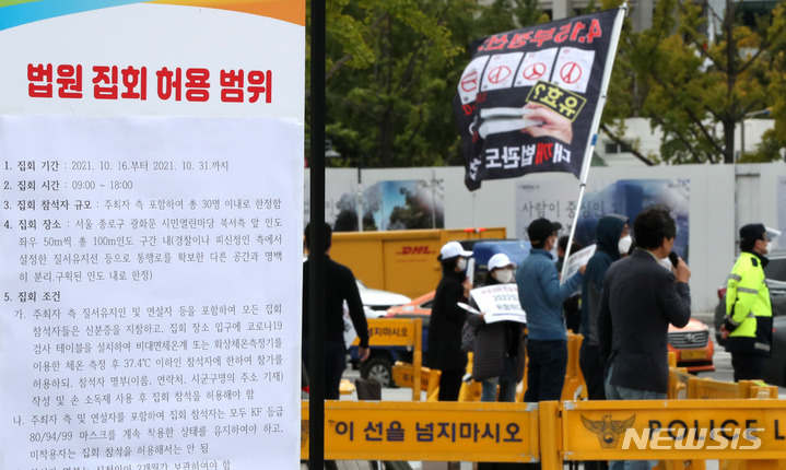 [서울=뉴시스] 추상철 기자 = 16일 오후 서울 종로구 광화문 시민열린마당에는 집회를 열고 있는 한 단체 앞으로 법원 집회 허용 범위와 관련한 안내문이 게시돼 있다. 2021.10.16. [email protected]