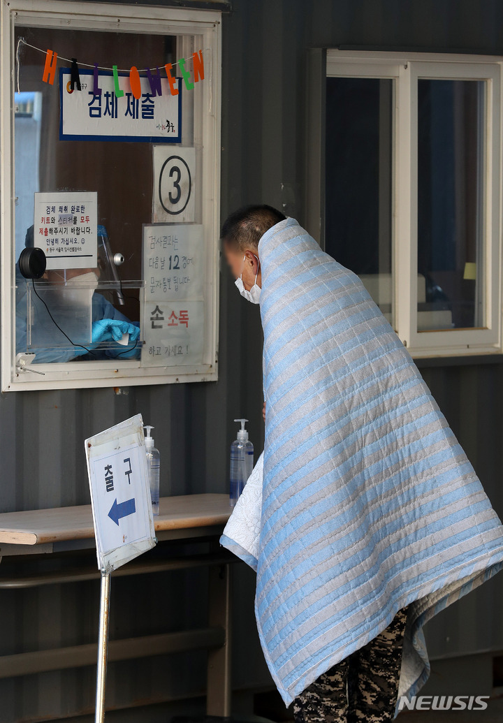 [서울=뉴시스] 백동현 기자 = 전국 대부분 지역에 한파특보가 내려진 17일 오전 서울 중구 서울역광장 임시선별검사소에서 한 시민이 담요를 덮고 있다. 서울에 10월 중 한파특보가 내려진 것은 2004년 이후 17년 만에 처음이다. 2021.10.17. [email protected]