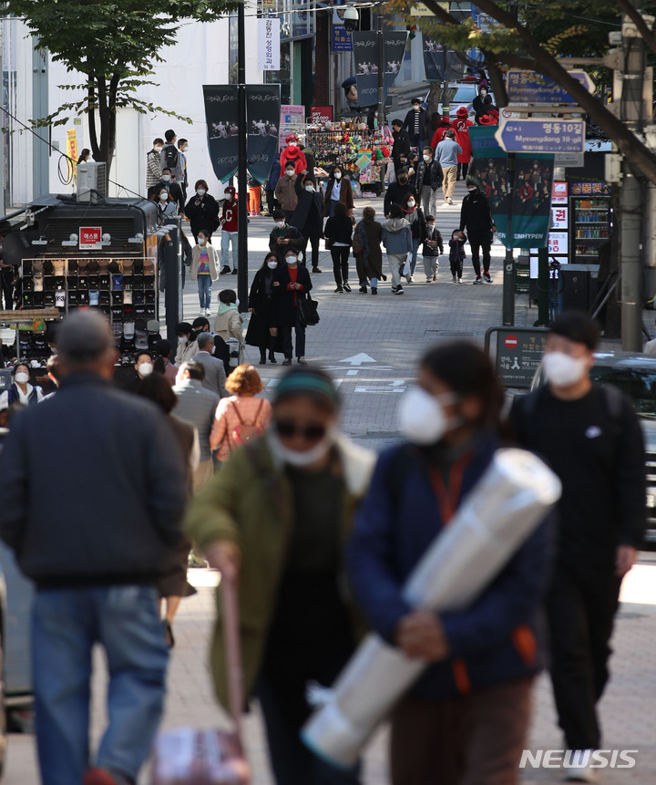 [서울=뉴시스] 박미소 기자 = 현행 사회적 거리두기 단계를 2주 연장을 하루 앞둔 17일 오후 서울 중구 명동 거리에서 시민들이 걸어가고 있다. 수도권을 비롯한 4단계 지역에서는 시간에 관계없이 접종 완료자 4~8명을 포함해 최대 8명까지 모일 수 있다. 4단계 지역의 식당·카페 영업 시간은 밤 10시까지로 계속 제한되지만 독서실·공연장·영화관은 밤 12시까지 운영할 수 있게 된다. 2021.10.17. [email protected]