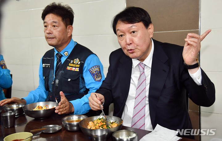 [부산=뉴시스] 하경민 기자 = 윤석열 국민의힘 대통령선거 경선 후보가 19일 부산 연제구 부산개인택시조합을 방문, 개인택시 기사들과 간담회를 가진 뒤 구내식당에서 비빔밥으로 점심식사를 하고 있다. 2021.10.19. [email protected]