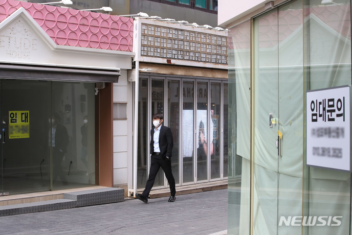 [서울=뉴시스] 박미소 기자 = 코로나19 확산으로 국내 취업자 중 자영업자가 차지하는 비중이 사상 처음으로 20% 아래로 떨어졌다고 밝혀진 19일 오후 서울 중구 명동 거리의 점포에 임대문의 안내문이 붙어있다. 19일 통계청의 '9월 고용동향'에 따르면 전체 취업자 중 자영업자가 차지하는 비중을 보면 19.97%로 사상 최저를 기록했다. 2021.10.19. [email protected]