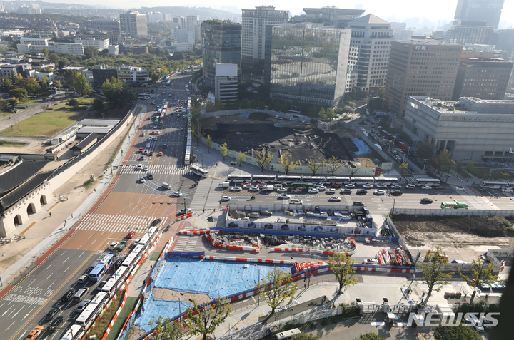 [서울=뉴시스] 김명원 기자 = 전국민주노동조합총연맹(민주노총)이 정부의 자제 요청에도 총파업과 대규모 집회를 강행하겠다고 밝힌 가운데 20일 오전 서울 종로구 광화문 주변에는 경찰이 집회에 대비해 '차벽' 설치하고 있다. 경찰은 대규모 민주노총의 총파업에 대비해 서울광장 더 플라자 호텔 인근부터 세종로 사거리를 지나 광화문광장까지 남북 구간, 그리고 서린동 일대부터 구세군회관까지 동서 구간에 십자 형태로 차벽을 설치했다. 2021.10.20. [email protected]