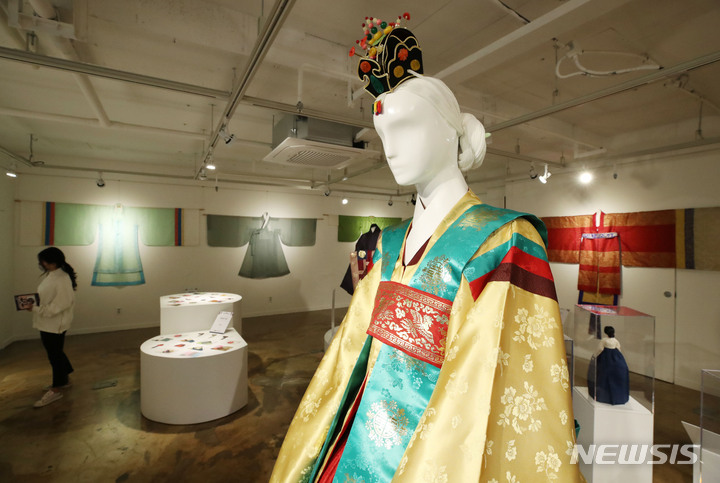 [서울=뉴시스] 박미소 기자 = 한복의 날인 21일 오후 서울 종로구 한국공예·디자인문화진흥원 갤러리에서 열린 한복전문교육지원 최종성과 전시 '펼치다'에서 한복 작품들이 전시되어 있다. 2021.10.21. [email protected]