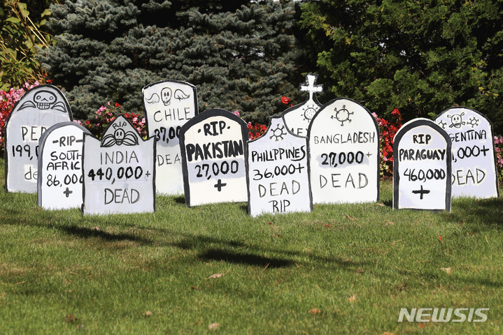 [스카스데일=AP/뉴시스] 21일(현지시간) 미 뉴욕주 스카스데일에서 의대생과 운동가들이 이날 생일을 맞은 앨버트 불라 화이자 CEO의 집 앞 잔디에 '화이자 묘지'를 만들어 저소득 국가 사람들에게 코로나19 백신 공급을 제한하는 화이자를 비난했다. 이들은 "(생일을) 축하할 시간이 없다"라며 "수많은 사람이 코로나19로 죽어갈 동안 화이자는 폭리를 취하고 있다"라고 쓰인 손팻말을 들고 시위를 벌였다. 2021.10.22.