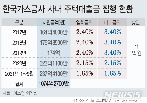 [서울=뉴시스] 22일 뉴시스가 이소영 더불어민주당 의원실을 통해 확보한 자료에 따르면 가스공사 임직원이 지난 2017년부터 올해 9월까지 받은 사내 대출액은 총 1074억2700만원이다. 주택담보인정비율(LTV)도 적용하지 않는데다 은행 대출과 무관하다. (그래픽=안지혜 기자)