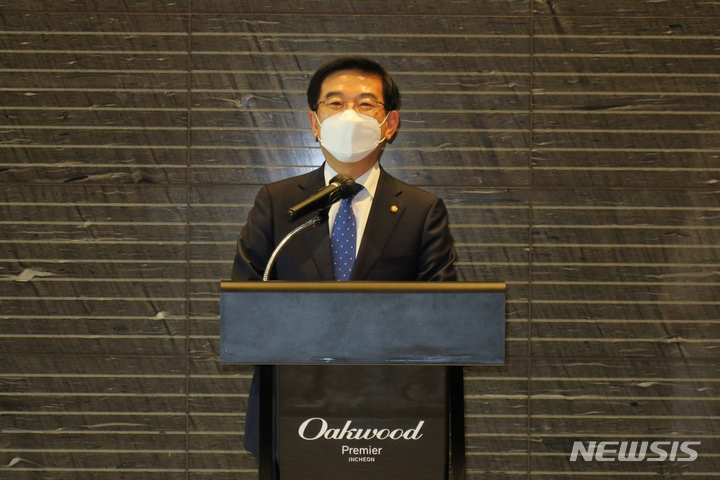 [인천=뉴시스] 김동영 기자 = 22일 오전 인천 연수구 송도국제도시 오크우드 프리미어 인천 5성 현판식에서 더불어 민주당 정일영 의원이 덕담을 하고 있다. 2021.10.22. [email protected]