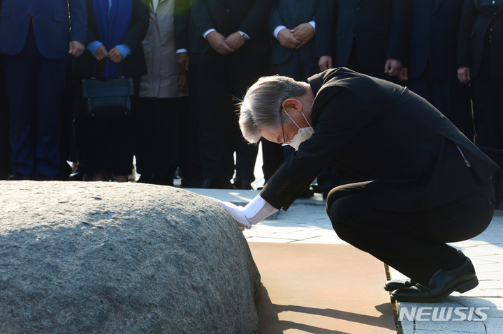 [김해=뉴시스] 차용현 기자 = 더불어민주당 이재명 대선후보가 22일 오후 경남 김해시 봉하마을 고(故) 노무현 전 대통령 묘소에서 너럭바위를 만지고 있다. 2021.10.22. [email protected]
