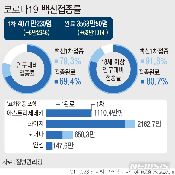 전체 인구(5134만9116명·2020년 12월 주민등록 거주자 인구) 대비 69.4%가 접종을 완료한 것이다. 18세 이상 성인의 접종완료율도 처음 80%를 넘어선 80.7%로 나타났다. (그래픽=안지혜 기자)
