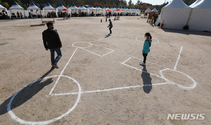 [서울=뉴시스] 추상철 기자 = 지속가능한 지구를 위한 '플라스틱 프리 페어' 박람회가 열린 24일 오전 서울 마포구 문화비축기지에서 가족단위의 관람객이 '오징어 게임'을 즐기고 있다. 2021.10.24. [email protected]