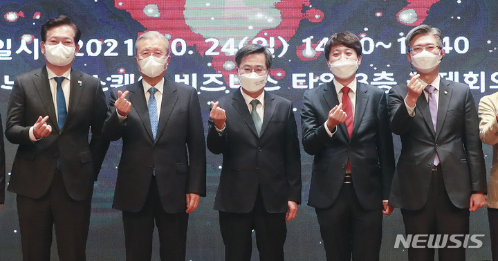 [서울=뉴시스] 국회사진기자단 = 김동연 전 경제부총리가 24일 서울 마포구 누리꿈스퀘어에서 열린 '새로운 물결' 창당 발기인 대회에서 송영길 더불어민주당 대표, 국민의힘 이준석 대표, 김종인 전 비상대책위원장 등 참석자들과 기념촬영을 하고 있다. 2021.10.24. [email protected]