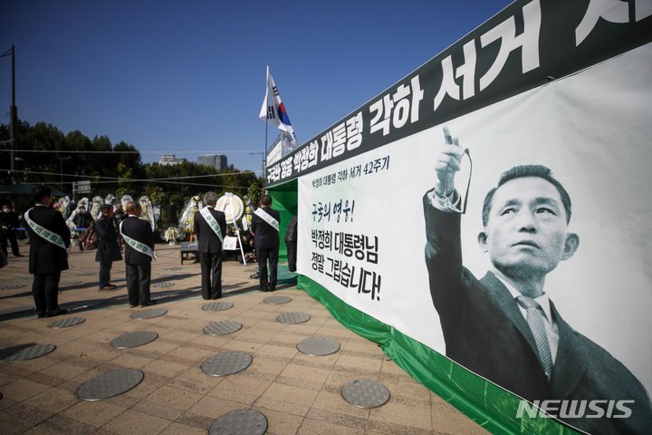 [서울=뉴시스] 정병혁 기자 = 박정희 전 대통령의 서거 42주기를 하루 앞둔 25일 오후 서울 중구 서울광장에 우리공화당  추모 분향소가 설치되어 있다. 2021.10.25. [email protected]