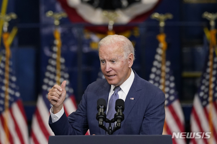 [커니=AP/뉴시스] 조 바이든 미국 대통령이 25일(현지시간) 미 뉴저지주 커니의 교통 정비 단지를 방문해 '더 나은 재건'(Build Back Better) 의제와 관련해 연설하고 있다. 바이든 대통령은 "미국을 세계에서 가장 발전한 나라로 재건하자"라며 초당적 인프라 법안과 사회복지성 지출 법안 통과를 강조했다. 2021.10.26.