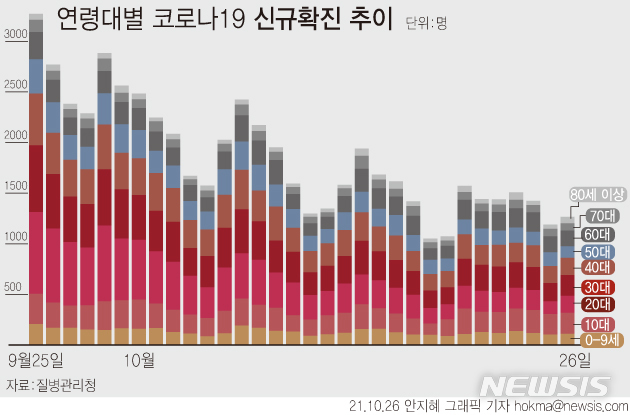 [서울=뉴시스] 26일 0시 기준 신규 코로나19 확진자 수는 1266명이다. 연령대별로는 10대가 전체 신규확진자의 16.4%로 집계됐다. 다음으로 30대가 16.2%, 40대 13.5%, 20대 13.2% 순이다. (그래픽=안지혜 기자)