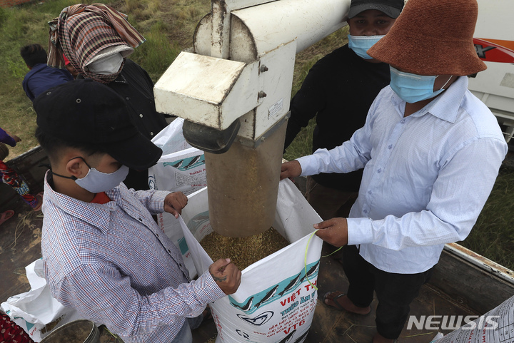 [프놈펜=AP/뉴시스] 27일(현지시간) 캄보디아 프놈펜 외곽의 한 마을에서  벼 수확기를 맞은 농민들이 탈곡기의 쌀을 자루에 채우고 있다. 캄보디아 우기가 끝나면서 벼 수확이 시작됐다. 2021.10.27.