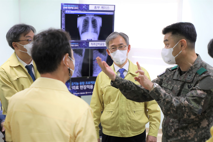 [서울=뉴시스] 김진아 기자 = 국방부와 과학기술정보통신부, 정보통신산업진흥원, 국방기술진흥연구소가 27일 경기 성남 국군수도병원에서 군의료 분야 인공지능 융합 프로젝트(AI+X) 개발 솔루션 시범적용 선포식을 개최, 최병섭 의무사령관이 한현수 국방부 기회조정실장과 박윤규 과기정통부 정보통신정책실장 등 관계관들에게 의료영상 판독 솔루션 적용 현장을 설명하고 있다. (사진=국방부 제공) 2021.10.27. [email protected]