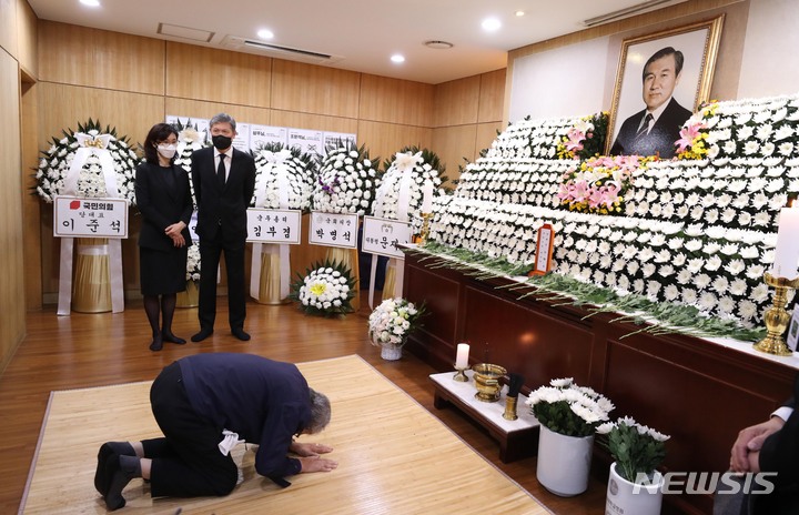 [서울=뉴시스] 사진공동취재단 = 노재헌 동아시아문화센터 이사장과 노소영 아트센터 나비 관장이 27일 서울 종로구 서울대학교병원 장례식장에 마련된 노태우 전 대통령 빈소에서 조문객을 맞이하고 있다. 2021.10.27. [email protected]