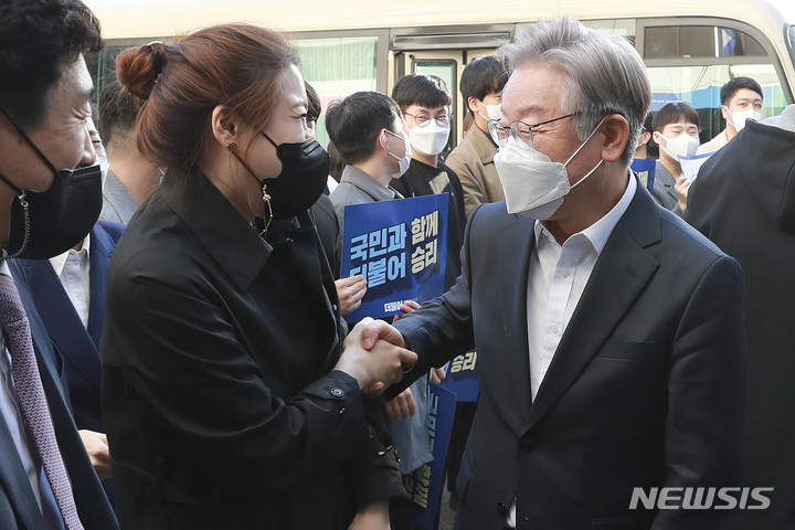[서울=뉴시스] 국회사진기자단 = 이재명 더불어민주당 대선 후보가 27일 서울 여의도 더불어민주당 당사를 방문해 당직자들과 인사하고 있다. 2021.10.27. [email protected]