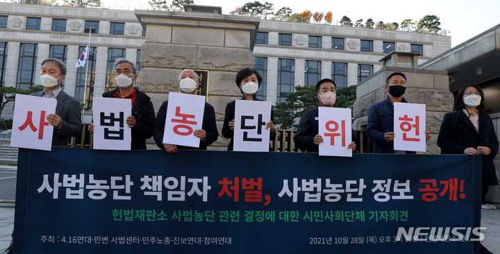 [서울=뉴시스] 추상철 기자 = 참여연대 사법감시센터가 28일 오후 서울 종로구 헌법재판소 앞에서 '사법농단 헌법재판소 선고' 관련 시민사회단체 가자회견을 하고 있다. 2021.10.28. [email protected]