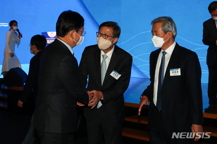 [서울=뉴시스] 국회사진기자단 = 더불어민주당 송영길(왼쪽) 대표가 28일 오후 서울 중구 대한상공회의소에서 열린 '2030부산세계박람회' 유치를 위한 국제콘퍼런스에서 박형준(가운데) 부산시장, 정몽준 아산재단 이사장과 인사하고 있다. 2021.10.28. [email protected]