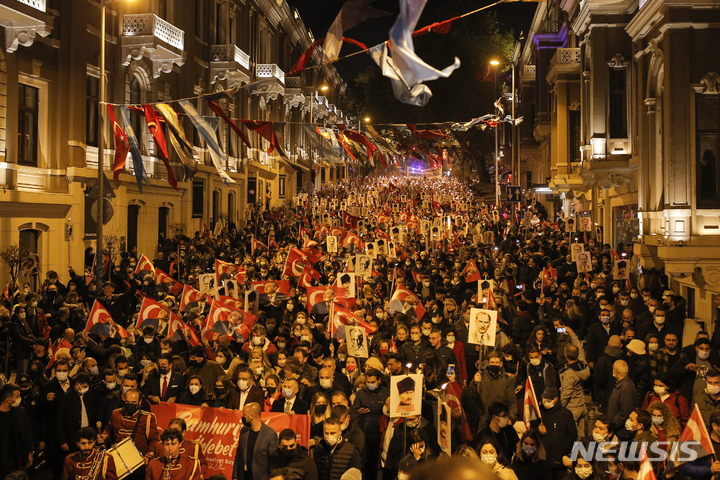 [이스탄불=AP/뉴시스] '터키 공화국의 날'인 29일(현지시간) 이스탄불에서 시민들이 터키 국부 '무스타파 케말 아타튀르크' 사진과 촛불을 들고 행진하고 있다. 터키는 아타튀르크가 1923년 터키 공화국을 선포한 건국 98주년을 맞았다. 2021.10.30.