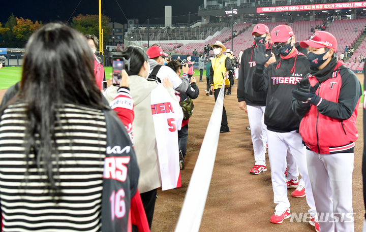[광주=뉴시스] 류형근 기자 = KIA 타이거즈 선수단이 30일 오후 광주 북구 광주-기아챔피언스필드에서 2021프로야구 마지막 경기를 치른 뒤 응원을 해준 팬들을 배웅하고 있다. 2021.10.30. [email protected]