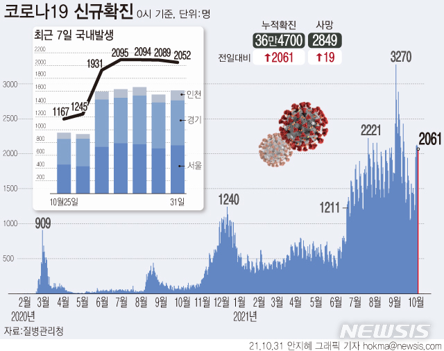 [서울=뉴시스] 31일 0시 기준 누적 코로나19 확진자는 전날보다 2061명 증가한 36만4700명으로 집계됐다. 코로나19 사망자는 19명 늘어 누적 2849명이다. 누적 치명률은 0.78%다. (그래픽=안지혜 기자)