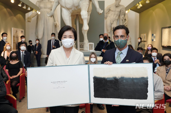 [로마=뉴시스] 김진아 기자 = 김정숙 여사가 30일 오후(현지시간) 국립로마미술대학에서 열린 이탈리아 한지 관련 전문가들과의 간담회에서 리카르도 아요싸 국립로마미술대학교 종이연구실 실장으로부터 학생들이 만든 한지를 선물 받고 기념촬영을 하고 있다. 2021.10.31. [email protected]