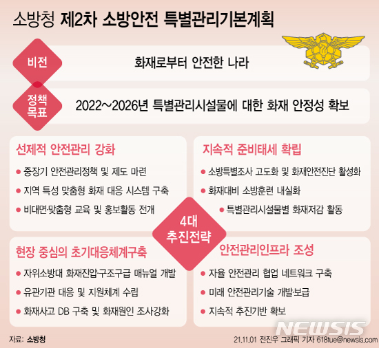 [서울=뉴시스] 소방청은 '제2차 소방안전 특별관리기본계획'(2022~2026)을 수립·시행한다고 1일 밝혔다. 인천국제공항·롯데월드타워과 같은 특별관리시설물에 대한 화재안전 진단·관리가 대폭 강화된다. (그래픽=전진우 기자)