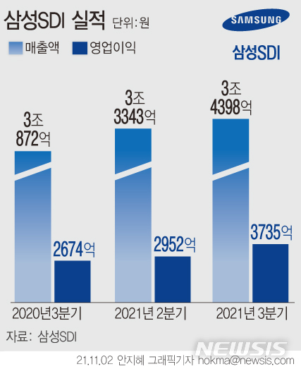 [서울=뉴시스] 삼성SDI는 3분기 연결 기준 영업이익이 3735억원을 기록, 전년 동기보다 39.7% 증가했다고 2일 공시했다. 전년 동기 대비 매출은 3조4398억원으로 11.4% 증가했다. (그래픽=안지혜 기자)