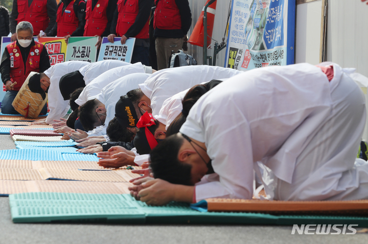 [서울=뉴시스] 배훈식 기자 = 민주노총 공공운수노조 한국가스공사비정규지부 조합원들이 2일 오전 서울 여의도 더불어민주당사 앞에서 비정규직 정규직 전환을 촉구하며 108배를 하고 있다. 2021.11.02. [email protected]