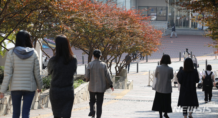 [서울=뉴시스] 권창회 기자 = 교육부의 '교육분야 단계적 일상회복 추진방안'에 따라 대학의 대면수업이 확대되고 있는 2일 오후 서울 용산구 숙명여자대학교에서 학생들이 발걸음을 옮기고 있다. 2021.11.02. [email protected]